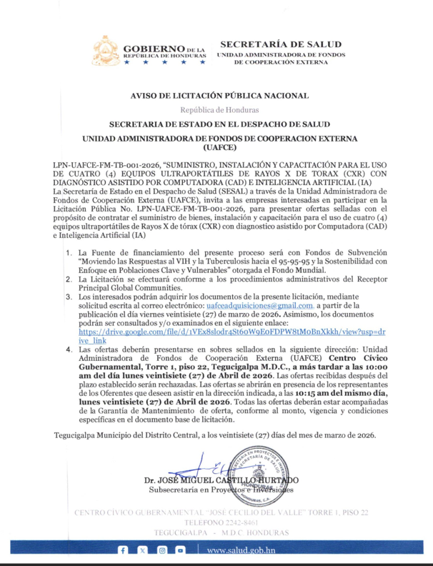 Licitación: Suministro, instalación y capacitación para el uso de 4 Equipos Ultraportátiles de Rayos X de Tórax con diagnóstico asistido por computadora e inteligencia artificial