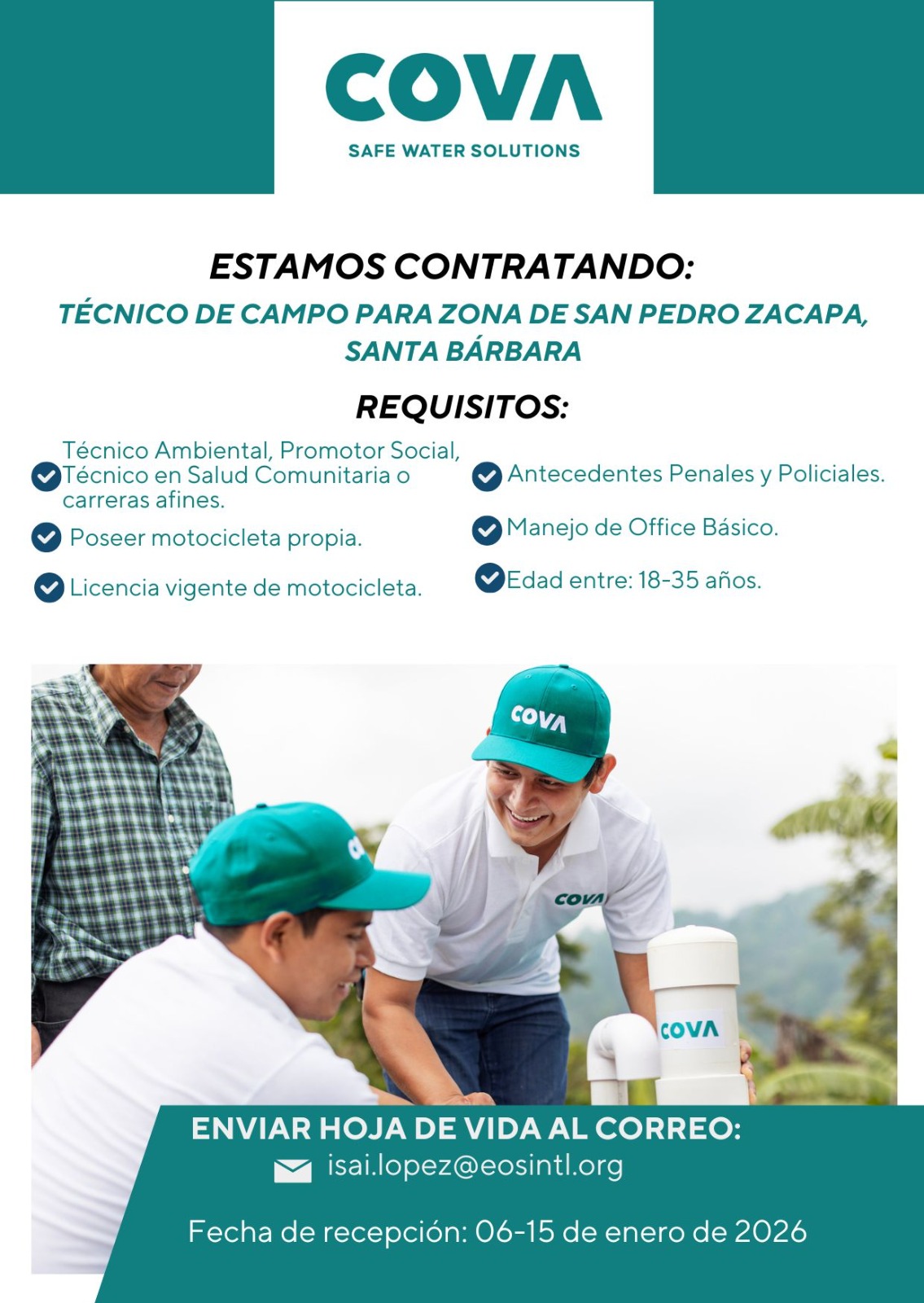 COVA está contratando a dos (2) Técnicos de campo para atender los municipio de: